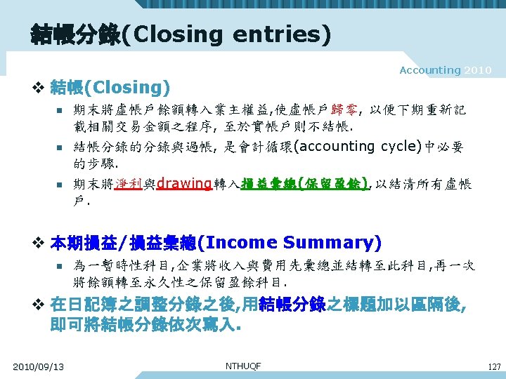 Closing the Books Accounting 2010 Note: Owner’s Drawing is closed directly to Capital and not to Income Summary because Owner’s Drawing is not an expense. 2010/09/13 Owner’s Capital is a permanent account; all other accounts are temporary accounts. NTHUQF 131