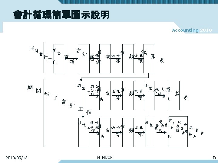 Summary of the Accounting Cycle Accounting 2010 1. 分析企業的交易 9. Prepare a post-closing trial balance (編制結帳後試算表) 2. Journalize the transactions (將交易寫成分錄) 8. Journalize and post closing entries (寫結帳分錄並過帳) 3. Post to ledger accounts 過到分類帳) 7. Prepare financial statements 4. Prepare a trial balance (編制調整前試算表) 6. Prepare an adjusted trial balance(編制調整後試算表) 5. Journalize and post adjusting entries (寫調整分錄並過帳) 2010/09/13 NTHUQF ( 139