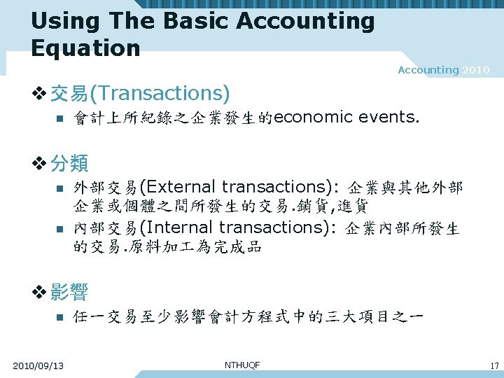 Owners’ Equity Accounting 2010 v 業主權益增加(Increase in owner’s equity) n n n 會因為業主投資(investment by owner)或收入(revenue)而增 加 Investment by owner: 業主將個人的資本投資於企業 Revenues: (a) The gross increases in OE that result from operating the business (因獲利活動而導致權益增加) (e. g. , sale, service, rental of property, rent) (b) Revenues =>an increase in an asset. v 業主權益減少(Decrease in owner’s equity) n n n 2010/09/13 會因為業主提取(Drawing)或費用(Expense)而減少: Drawing: 業主從企業領取現金或其他資產供私人使用 Expense: (a) 經營企業而使業主權益減少的部分(付出或耗用的資產或 勞務 e. g. , cost of ingredients, wage, utility expense, interest expense, …) (b) Revenues > (< ) Expenses => Net income (Net loss) NTHUQF 16
