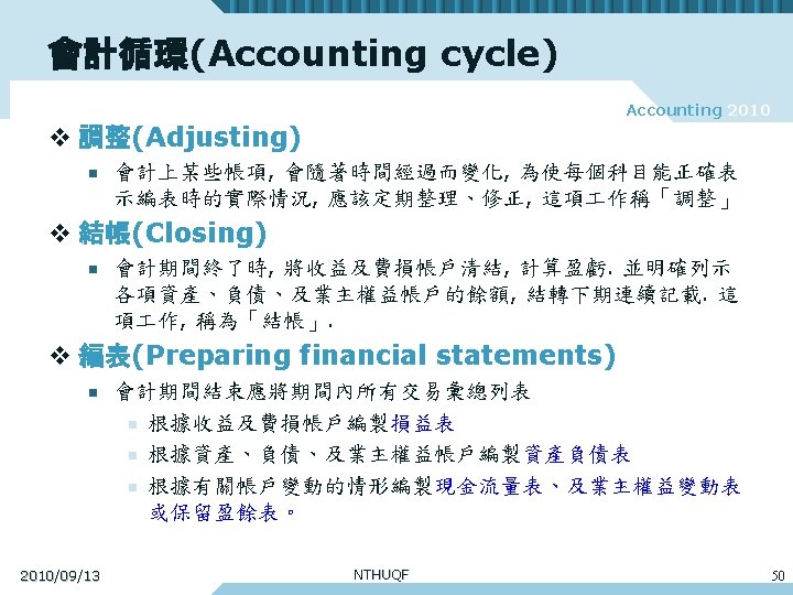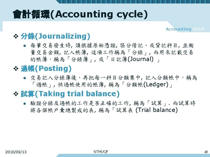 會計循環(Accounting cycle) Accounting 2010 v 會計 作週而復始,每期都是從分錄開始,到編 製報表為止。 n n n 2010/09/13 「分錄」 「過帳」 「試算」 「調整」 「結帳」 「編表」 (Journalizing) (Posting) (Taking trial balance) (Adjusting) (Closing) (Preparing financial statements) NTHUQF 48