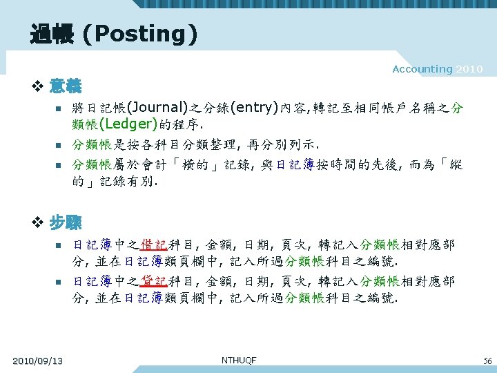 Technique of Journalizing Accounting 2010 類頁欄位(Ref. )是空白的, 直到要過入分類帳時, 才填入所過入的 分類帳的頁碼 2010/09/13 NTHUQF 55