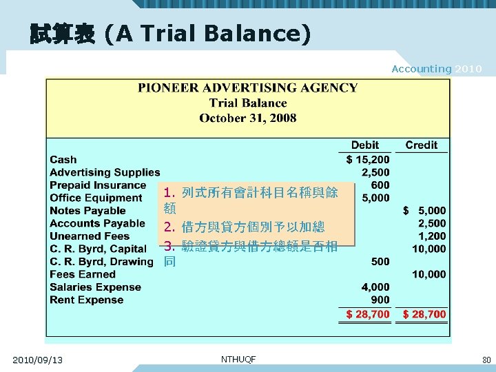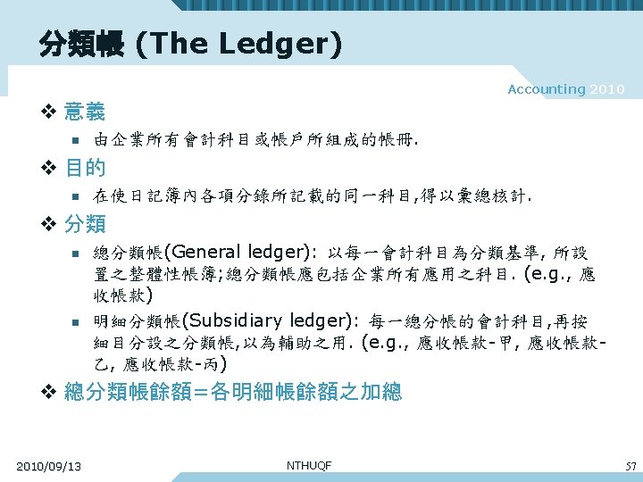 Double-entry System (複式簿記) Accounting 2010 v 左借右貸, 有借就有貸 (A = L + OE) v Total debits always equal the total credits. v The accounting equation will always stay in balance. 2010/09/13 NTHUQF 42