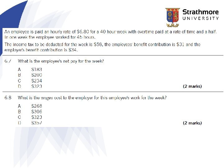 Example: gross pay to net pay • An employee is paid at; – an hourly rate of $7. 00 for a 35 hour week – with any overtime hours paid at time and a half. – During week 22 the employee worked for 41 hours. • The income tax to be deducted was $55, the Employee's benefit contributions for the week were $28, and the Employer's benefit contributions were $29. • What is the employee's net pay? • What is the labour cost to the employer for this employee for the week?