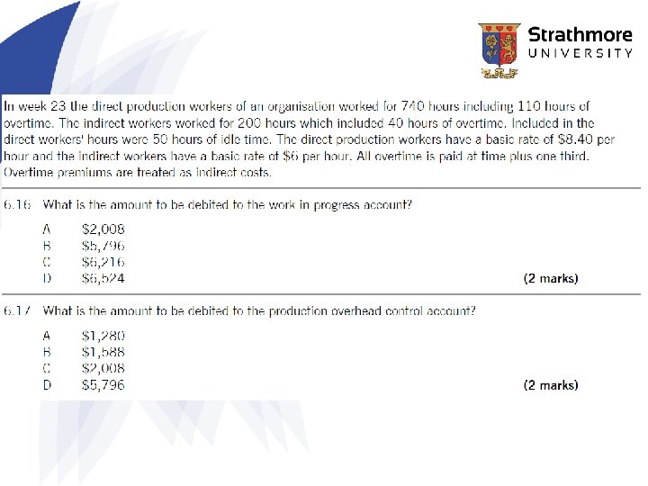 Example: overtime and idle time • Given below are the labour costs incurred by a manufacturing business for the week commencing 23 July 20 X 5. – Direct production workers 120 hours at $6. 40 per hour – Direct production workers overtime hours 20 at $9. 40 per hour – Indirect workers 40 hours at $5. 20 per hour – Indirect workers overtime hours 5 at $8. 00 per hour – Of the hours paid to the direct production workers 4 of these were idle time hours. • What is the total for direct labour and indirect labour for the week?