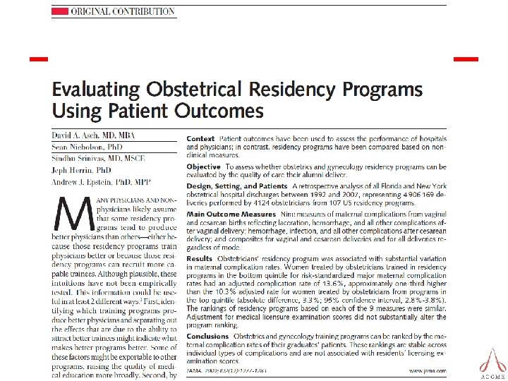 Evaluating Residency Programs Using Patient Outcomes n= 4, 906, 169 deliveries in Florida and New York, 1992 -2007 4124 physician program graduates of 107 residency programs Difference remains after correction for USMLE performance Excess Risk ∆ 33% Q 1 vs Q 5 ∆ JAMA 2009; 302(12): 1277 -1283. Asch, DA, et. al. , Table 4