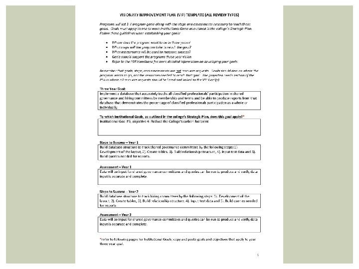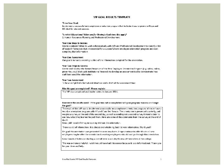 VIP Goal Implement a database that accurately tracks all classified professionals’ participation in shared governance and hiring committees by membership and terms and be able to produce reports from that database that demonstrates the percentage of classified professionals participation as a whole or individually. Strategic Plan Goal Institutional Goal 3, Objective 3: Accreditation Standard IV. A. 1 III. A. 14 Implement appropriate training orientation and professional development for all employee groups. Implement a cloud-based filing system Institutional Goal 6, Objective 4: that will allow Classified Senate Officers, Senators, and Administrative Assistant Reduce the College’s carbon footprint. to track, share, and store documents used in the planning of campus events. I. B. 1 IV. A. 1