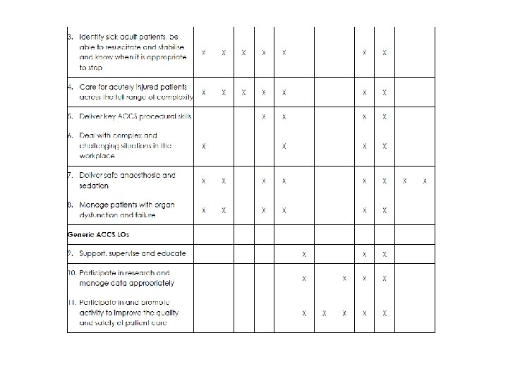 Learning outcomes • ACCS LOs describe professional tasks or work within the scope of ACCS • Clinical ACCS LOs are based on “Entrustable Professional Activities” • Each clinical ACCS LO has Key Capabilities described to give clear guidance to trainees and faculty as to what is expected