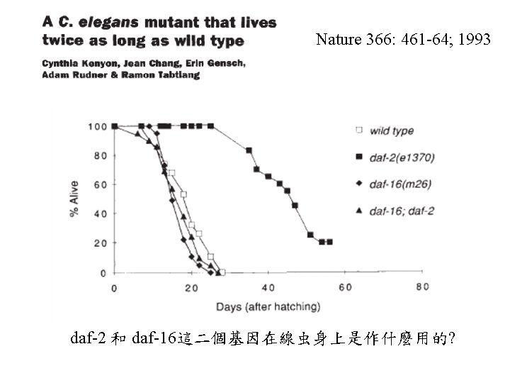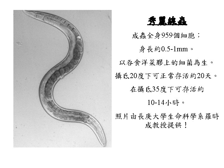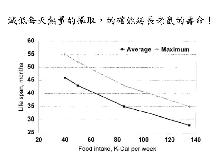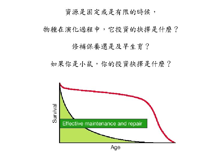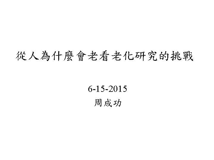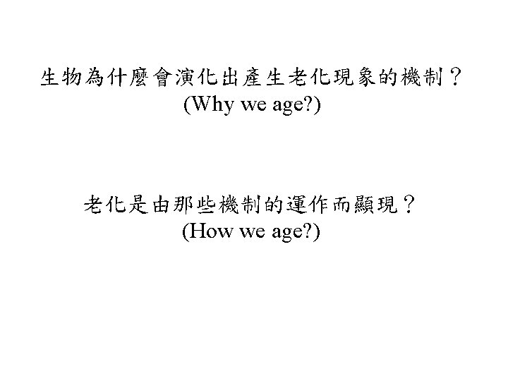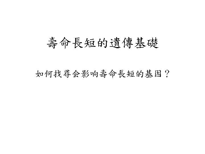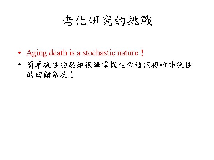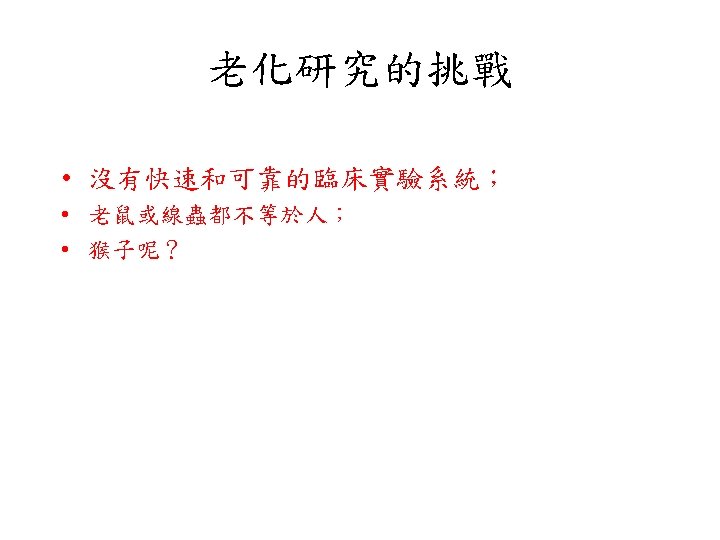老化研究的挑戰 • 老鼠或線蟲都不等於人; • Aging death is a stochastic nature • Aging in laboratory animal is not equivalent to aging in wild animal • 沒有快速和可靠的藥物篩選系統;