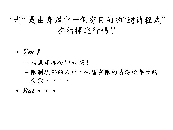 Accumulation of germ-line mutations with late-acting deleterious effects 在平均年齡 30歲的族群中累積了許多 60歲才會發作的基因突變 …the forces of natural selection weakens with increasing age …. If a genetical disaster… happens late enough in individual life, its consequences may be completely unimportant. Even in such a crude and unqualified form, this dispensation may have a real bearing on the origin of innate deterioration with increasing age. Medawar, 1952