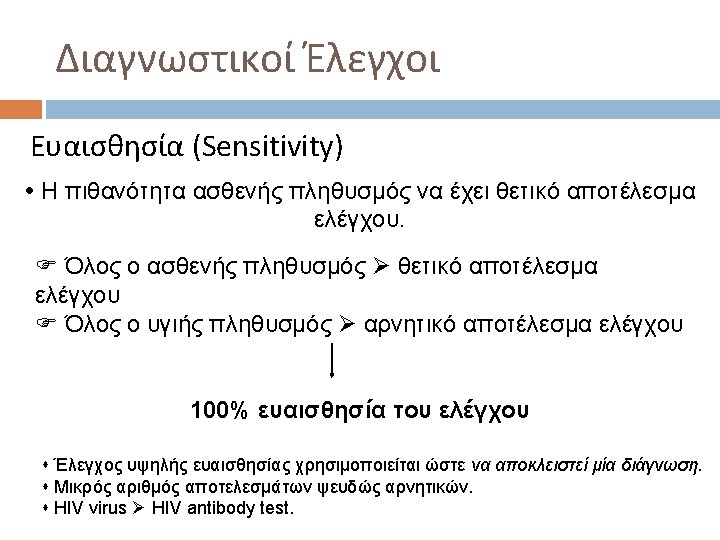 Διαγνωστικοί Έλεγχοι Ευαισθησία vs. Εξειδίκευση Ελέγχου the higher the sensitivity, the lower the specificity, and vice versa.