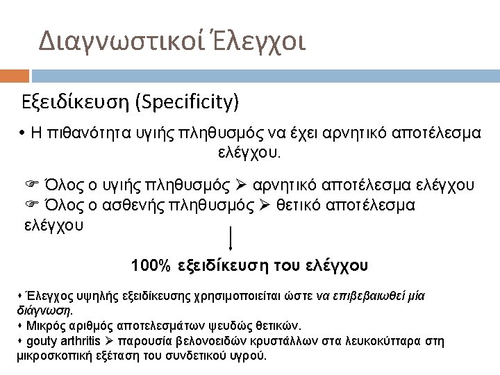 Διαγνωστικοί Έλεγχοι The specificity of a clinical test refers to the ability of the test to correctly identify those patients without the disease. a test with 100% specificity correctly identifies all patients without the disease. a test with 80% specificity correctly reports 80% of patients without the disease as test negative (true negatives) but 20% patients without the disease are incorrectly identified as test positive (false positives).