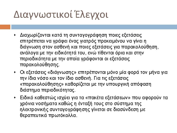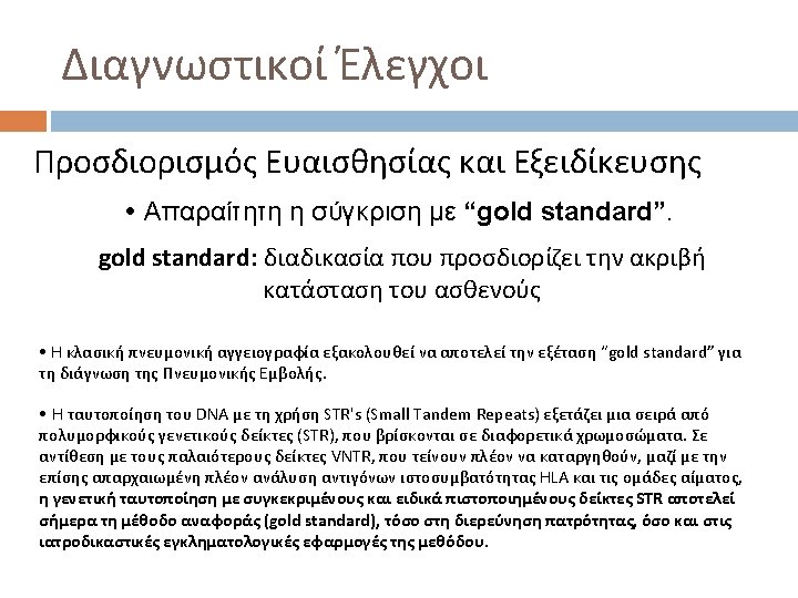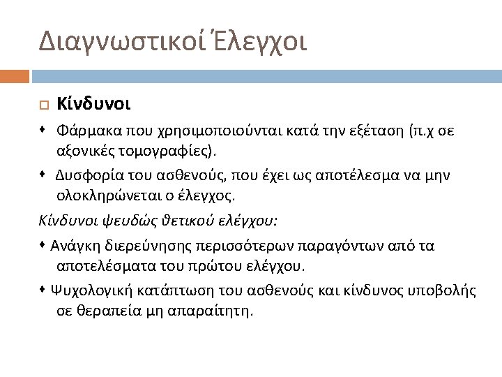 Διαγνωστικοί Έλεγχοι Ευαισθησία vs. Εξειδίκευση Ελέγχου True positive: the patient has the disease and the test is positive. False positive: the patient does not have the disease but the test is positive. True negative: the patient does not have the disease and the test is negative. False negative: the patient has the disease but the test is negative.