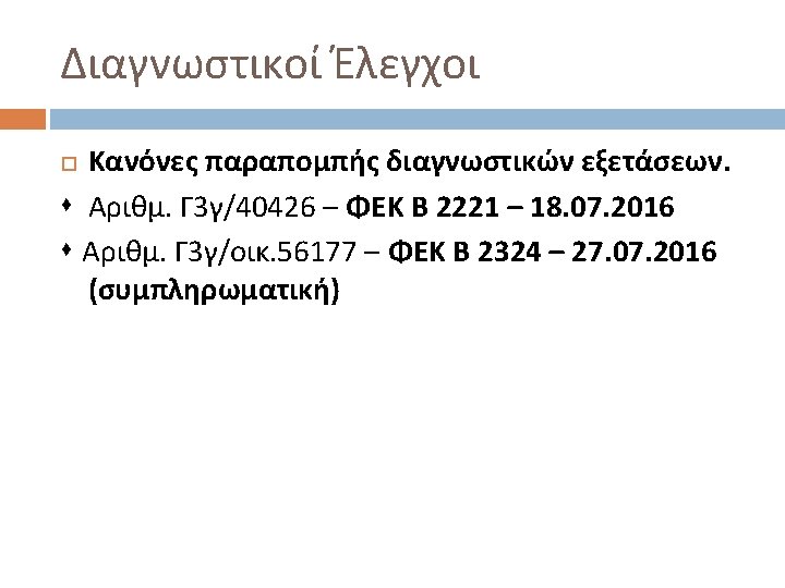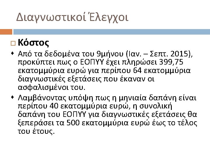 Διαγνωστικοί Έλεγχοι Patients with bowel cancer (as confirmed on endoscopy) Condition positive Fecal occult blood screen test outcome Test outcome positive Test outcome negative Condition negative False positive (FP) = 180 Positive predictive value= TP / (TP + FP) = 20 / (20 + 180) = 10% False negative (FN) = 10 True negative (TN) = 1820 Negative predictive value= TN / (FN + TN) = 1820 / (10 + 1820) ≈ 99. 5% Sensitivity= TP / (TP + FN) = 20 / (20 + 10) ≈ 67% Specificity= TN / (FP + TN) = 1820 / (180 + 1820) = 91% True positive (TP) = 20
