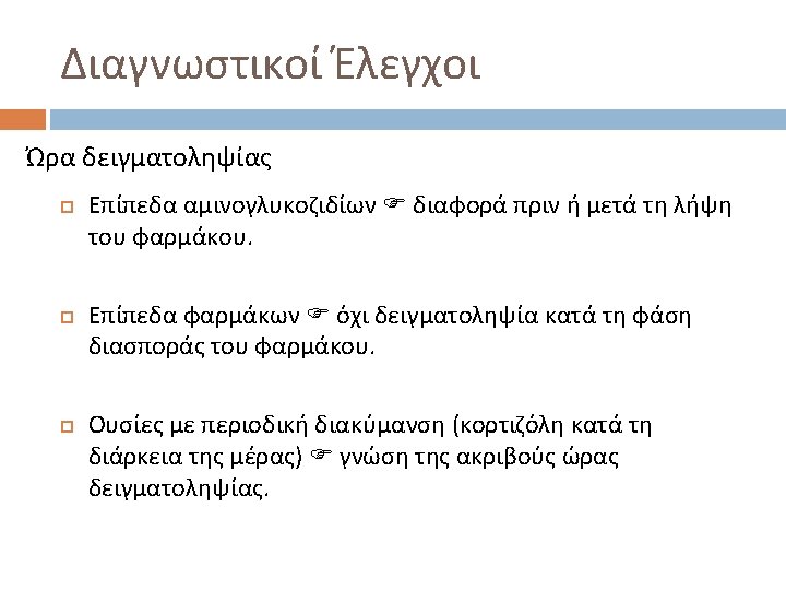 Διαγνωστικοί Έλεγχοι -Εφαρμογή Consider patients with T 4 values of 9 or less to be hypothyroid: T 4 value Hypothyroid Euthyroid 29 54 3 39 32 93 < 9 9 or more Totals: the sensivity is 0. 91 and the specificity is 0. 42. Cutpoint Sensitivity Specificity 5 0. 56 0. 99 7 0. 78 0. 81 9 0. 91 0. 42