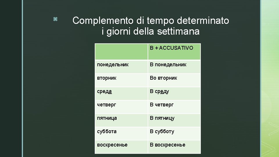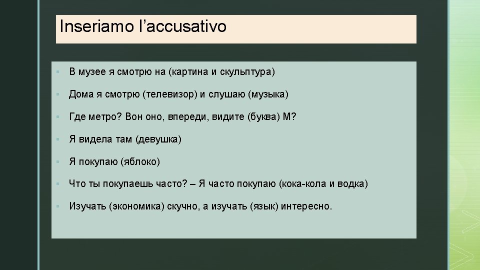 z Домашнее задание § Studiare Grammatica russa, pp. 216 -218, 222 (3^ ed. ); pp. 325 -326, 329 -330 (2^ ed. ) § Nikitina, Grammatica d’uso, lez. 9, pp. 18 -19: studiare la parte teorica, ricopiare e svolgere gli esercizi in corsivo, leggere ad alta voce, facendo attenzione alla posizione dell’accento. § Ricopiare e svolgere gli esercizi delle seguenti schede: http: //assagames. com/nas/rus/RFLK_007. pdf