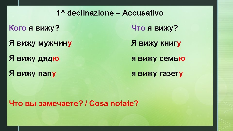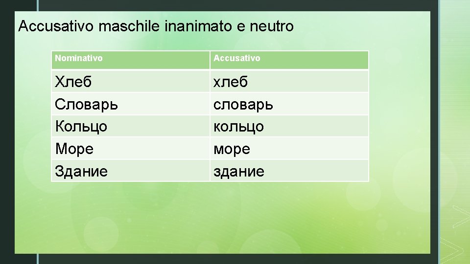 La desinenza dell’accusativo singolare dei sostantivi femminili e z maschili in –a, -я di prima coniugazione è -у per i sostantivi in vocale forte –a -ю per i sostantivi in vocale debole -я Nominativo Accusativo Сумка Группа Актриса Дядя Тётя сумку группу актрису дядю тётю