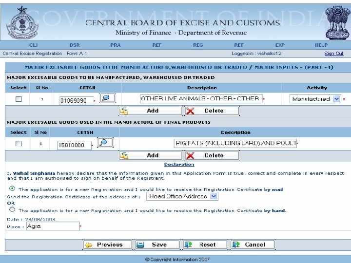 New Central Excise Registration Once registered with ACES Application, the assessee goes to ACES website and clicks on Central Excise Link, and fills in the user name & password to log in to the Application Select REG Module -> Option Fill Form, Fill Form A 1 or A 2 or A 3 or Declarant Form as the case may be This will enable Online filing of Application Form for Registration with Department