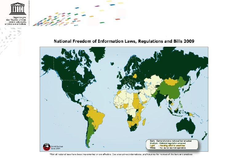 Acesso a Informação e Liberdade de Imprensa “O direito à informação é essencial para defender outros direitos fundamentais, para fomentar a transparência, a justiça e o desenvolvimento. Juntamente com o princípio de liberdade de expressão, o direito à informação funciona como apoio à democracia. É possível que nós não exerçamos, de maneira consciente, o nosso direito a informação. Mas, cada vez que nós lemos um jornal, ligamos a TV ou rádio para ver ou ouvir o noticiário, ou acessamos a Internet, a qualidade daquilo que nós vemos ou ouvimos depende do acesso que esses meios tiveram a informações atualizadas, críveis e precisas. ” Irina Bokova, Diretora-Geral da UNESCO, por ocasião das celebrações do Dia Mundial da Liberdade de Imprensa, 3 de maio de 2010.