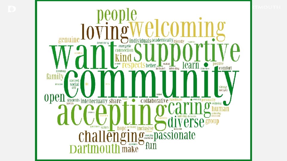 Principle of Community The life and work of a Dartmouth student should be based on integrity, responsibility, and consideration. In all activities each student is expected to be sensitive to and respectful of the rights and interests of others and to be personally honest. He or she should be appreciative of the diversity of the community as providing an opportunity for learning and moral growth.