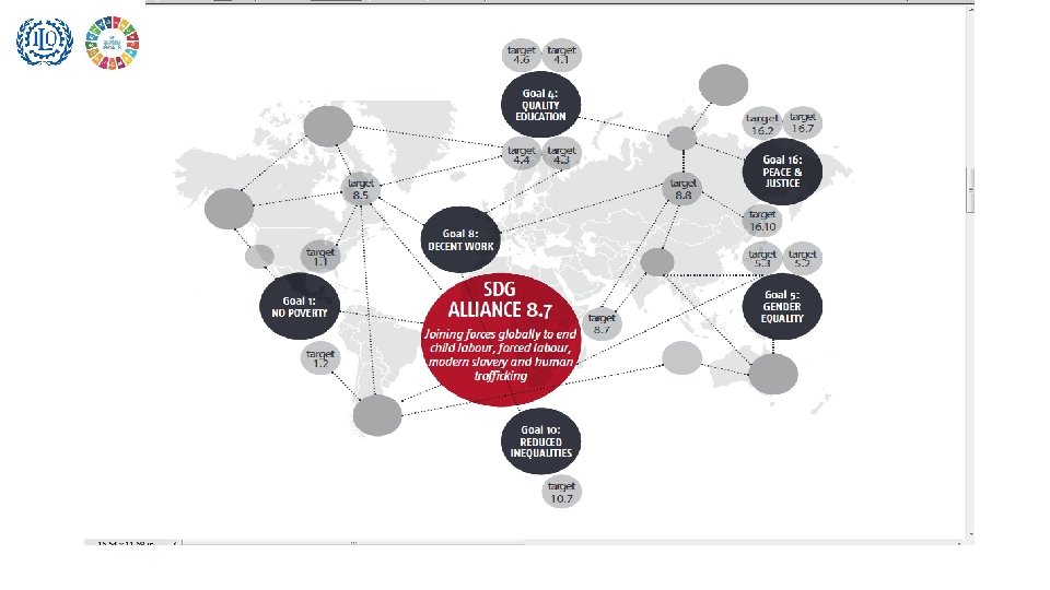 Decent Work and the SDGs – Agenda 8 SDG 8 : Promote sustained, inclusive and sustainable economic growth, full and productive employment and decent work for all 8. 3 promote development-oriented policies that support productive activities, decent job creation, entrepreneurship, creativity and innovation, and encourage formalization and growth of micro-, small- and medium-sized enterprises including through access to financial services 8. 5 by 2030 achieve full and productive employment and decent work for all women and men, including for young people and persons with disabilities, and equal pay for work of equal value 8. 6 by 2020 substantially reduce the proportion of youth not in employment, education or training 8. 7 take immediate and effective measures to secure the prohibition and elimination of the worst forms of child labour, eradicate forced labour, and by 2025 end child labour in all its forms including recruitment and use of child soldiers 8. 8 protect labour rights and promote safe and secure working environments of all workers, including migrant workers, particularly women migrants, and those in precarious employment