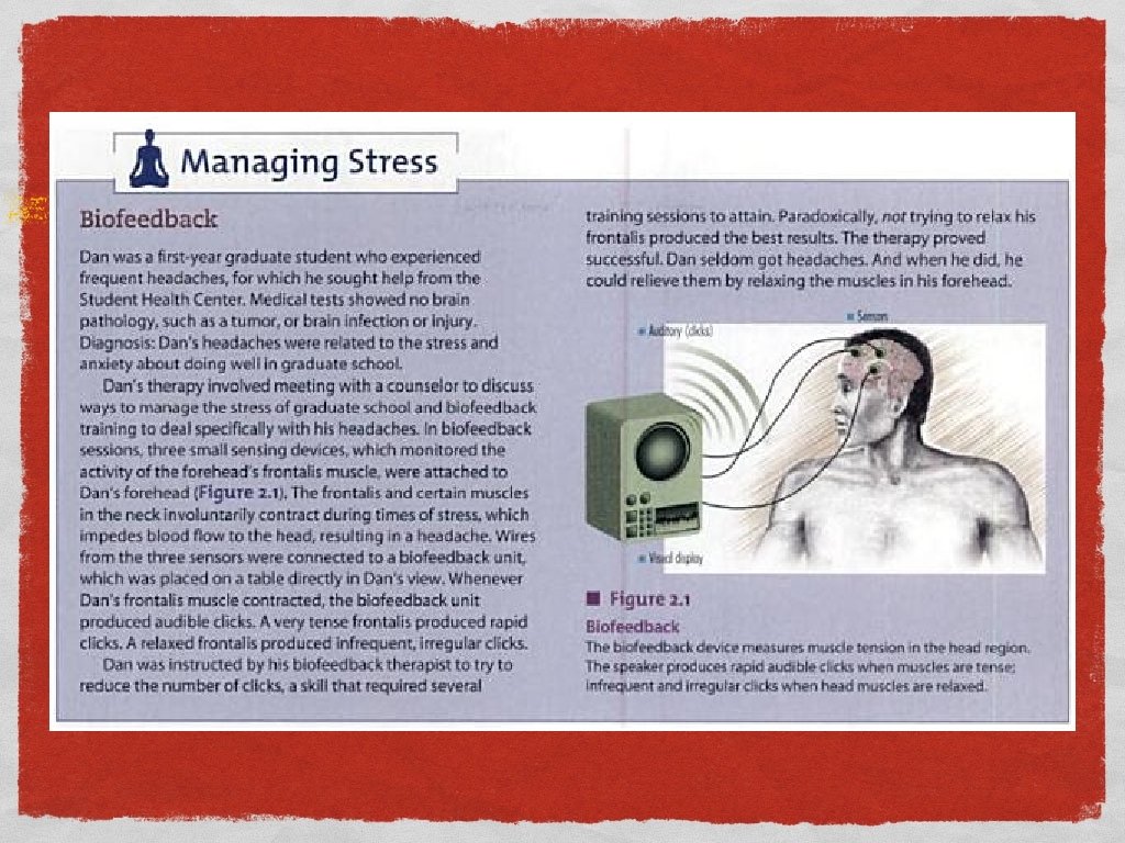 Mind can affect body, positive thought, positive outcome biofeedback: recording device to facilitate learned self control of physiological activities device connected to body region, info on bio activity is “fed back” A/V, with the info, the person can alter an activity eg used in panic attacks, headaches, high BP, back pain
