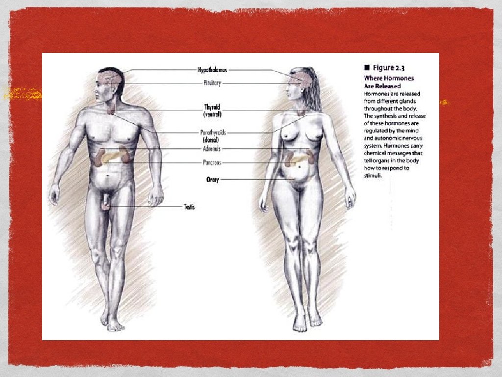 hormones: chemical produced by endocrine organs that notify the body of changes that must be responded to fear: SNS> Adrenaline> adrenal cortex > cytokines> affect body systems