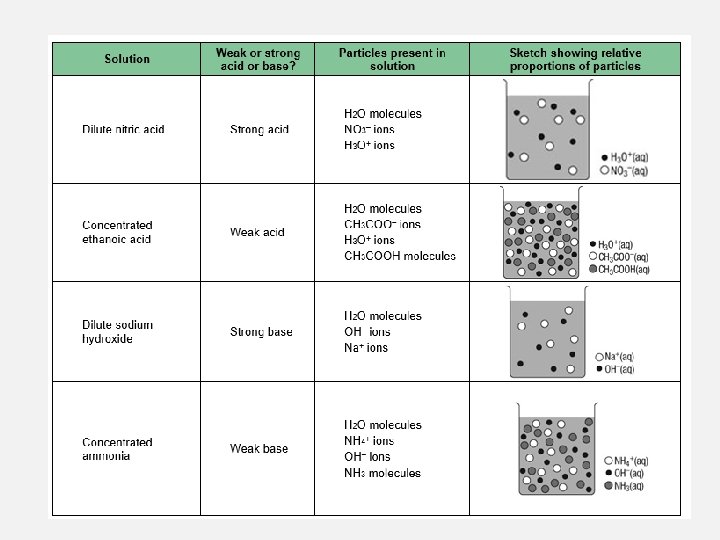 WEAK ACIDS • Weak acids only partly ionise to form hydrogen ions in water • A 1. 0 M solution of ethanoic acid, contains a high proportion of CH 3 COOH molecules and only some H 3 O+ and CH 3 COOH- ions • The partial ionisation of a weak acid is shown in an equation using reversible (double) arrows