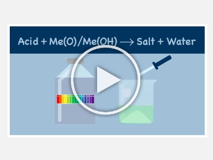 ACIDS AND METAL HYDROXIDES • Soluble metal oxides, such as Na. OH, dissociate in water to form metal cations and hydroxide ions • The products of a reaction of an acid with a metal hydroxide are an ionic compound called a salt and water acid + metal hydroxide salt + water • For example: solutions of sulphuric acid and sodium hydroxide react to form sodium sulfate and water