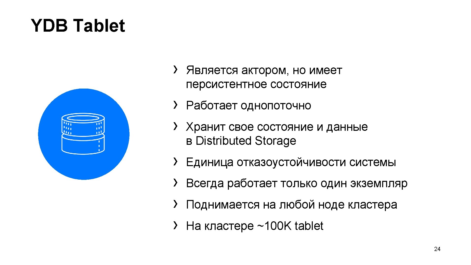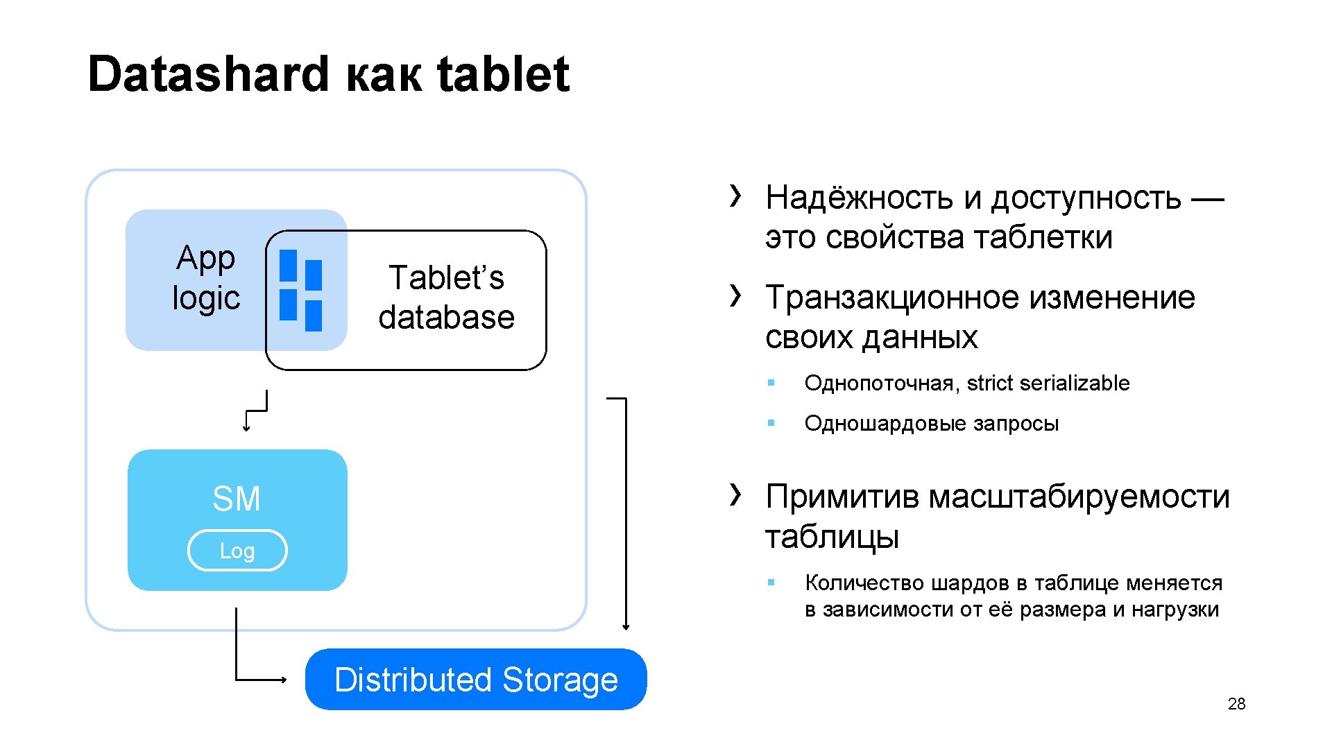 YDB Tablet Таблицы App logic SM Log Tablet’s database Put Get Collect. Garbage Put Get Block Discover Collect. Garbage Distributed Storage 27