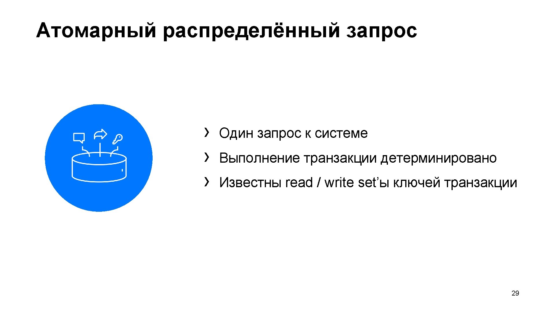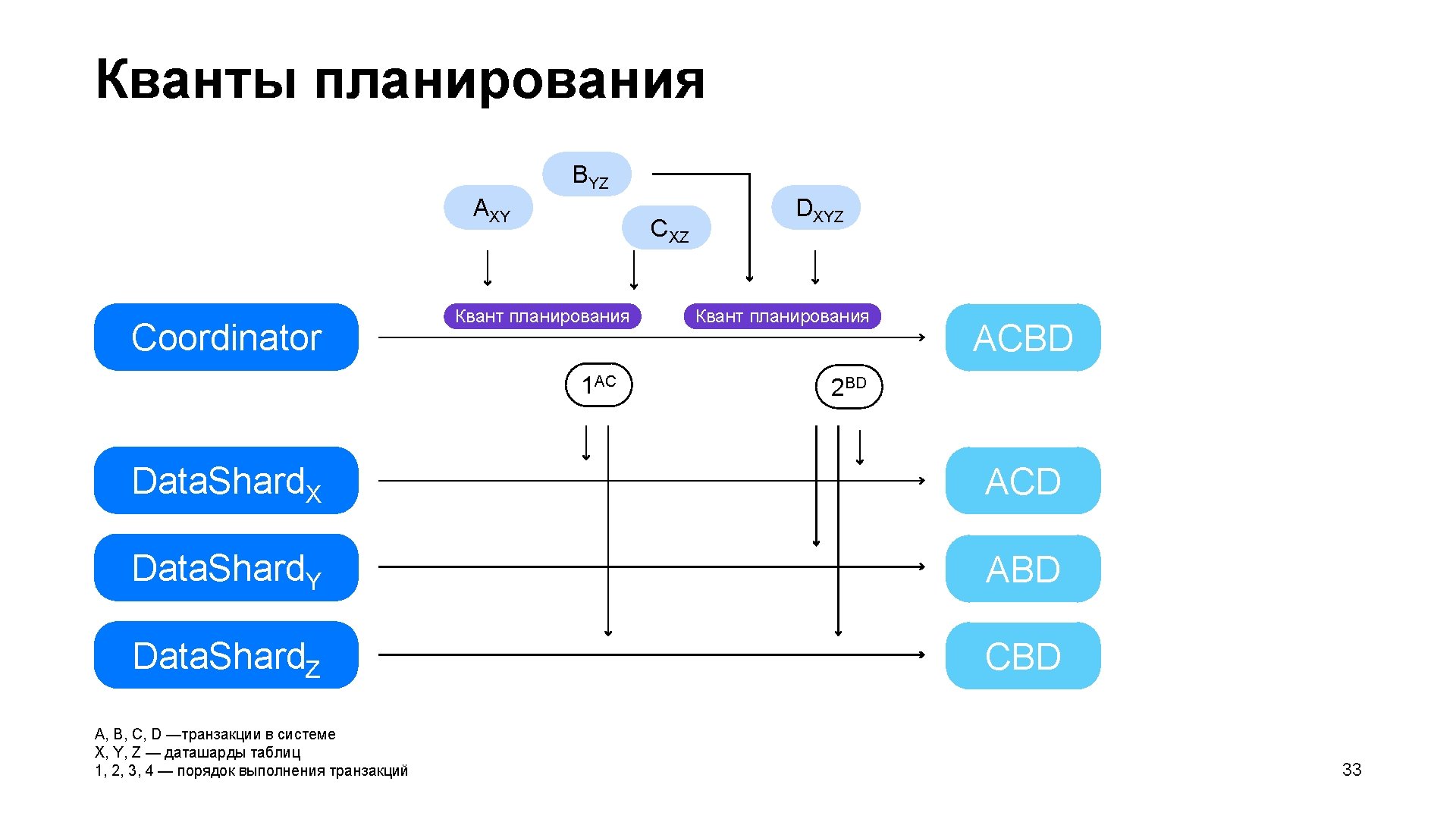 Транзакция RW Tx. Body Tx. Meta A Coordinators Mediators Persist Plan Read Data. Shard › › 1 RTT › › 0. 5 RTT › › › 0. 5 RTT 1 write 1 plan batch time 1 write 0. 5 RTT Persist Tx. Body Persist Plan. Step Out read set План Write Data. Shard Persist Tx. Body Persist Plan. Step Out read set Persist Result 1 write 0. 5 RTT ▎ Итого › 7. 5 RTT + 1 plan batch time + 4 disk. IO