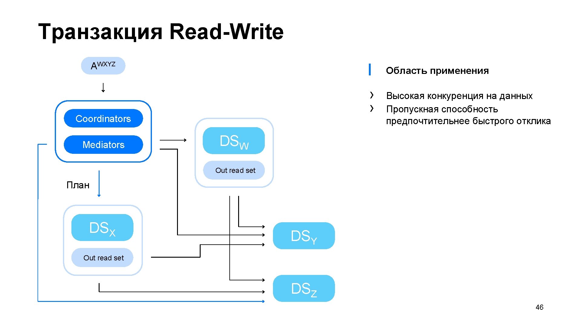 Транзакция RO / WO Tx. Body Tx. Meta A Coordinators Mediators Data. Shard Persist Plan Data. Shard Persist Tx. Body План Persist Plan. Step Data › › 1 RTT › › 0. 5 RTT › › › 0. 5 RTT 1 write 1 plan batch time 1 write 0. 5 RTT ▎ Итого › 6 RTT + 1 plan batch time + 3 disk. IO 45