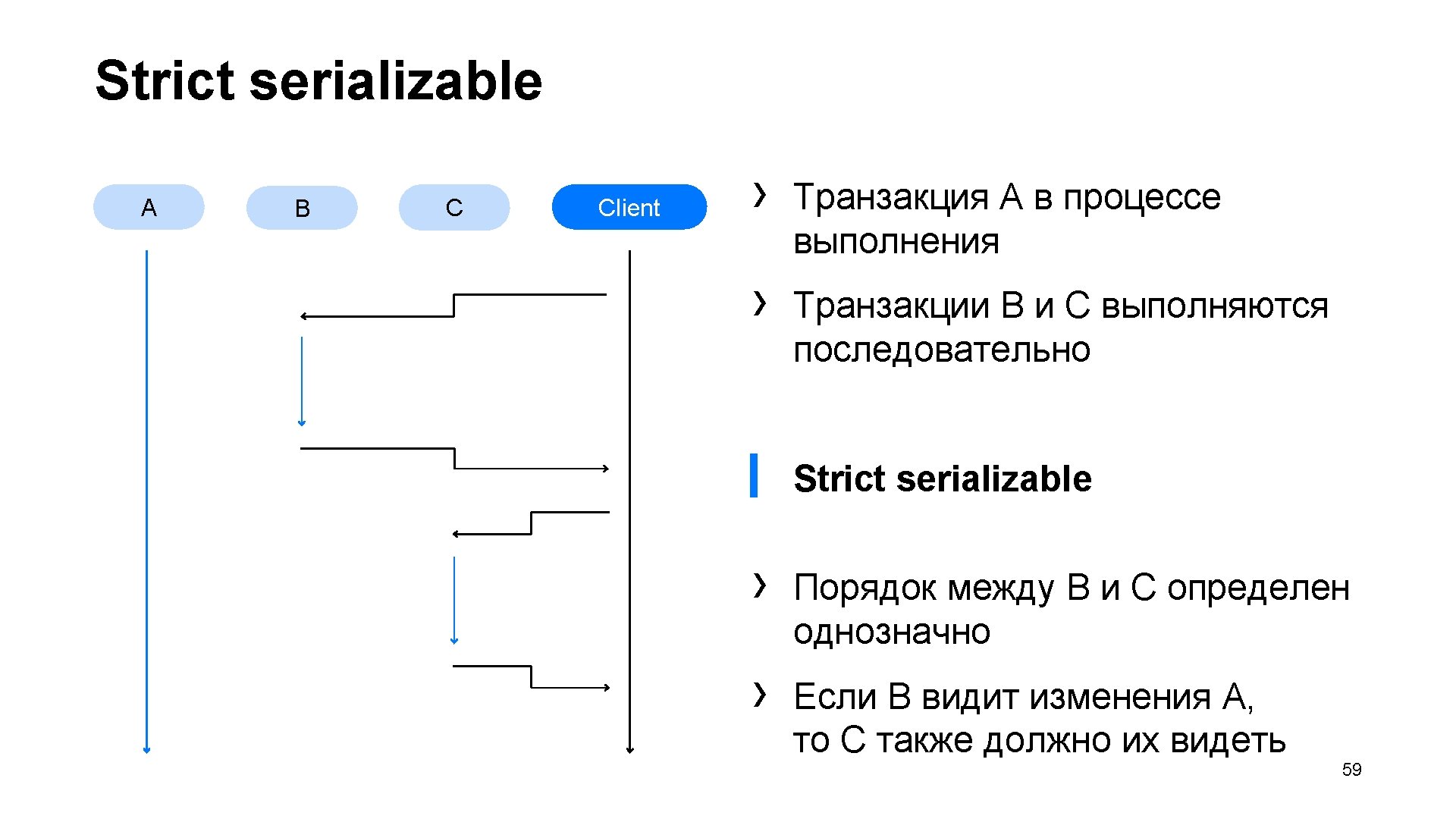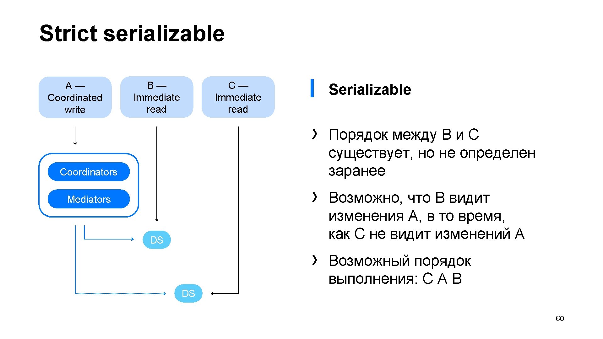 Уровень изоляции ▎ Serializable — default isolation level › Координируемые и immediate-транзакции ▎ Strict serializable — maximum isolation level › Все транзакции координируемы 58