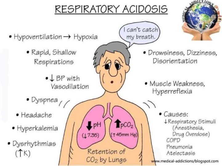 Manifestations of Resp Acidosis CARDIOVASCULAR: Related to coronary vasodilation 1. Tachycardia 2. Ventricular arrythmias (related to hypoxemia and not hypercapnia per se) • • BIOCHEMICAL ABNORMALITIES: CO 2 Cl PO 43 -