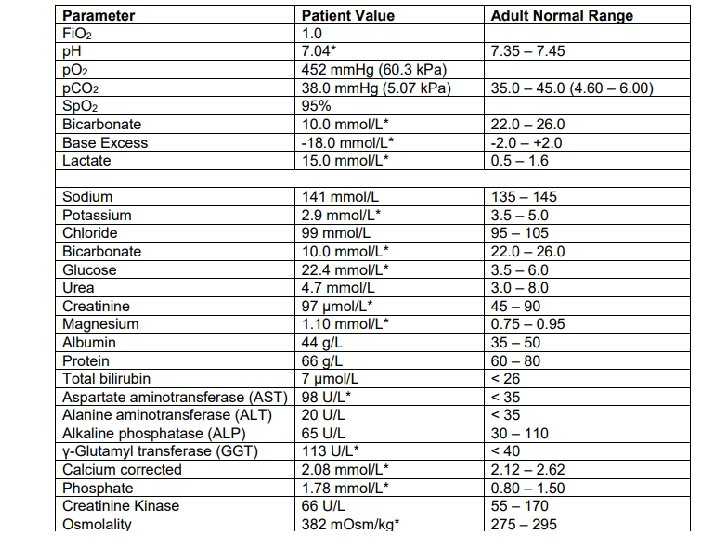 Question 2 • Step 1: Acidaemia • Step 2: Metabolic acidosis ? Respiratory acidosis • Step 3: AG 141 -99 -10=32 (ref 8 -12) • Step 4: Compensation Expected p. CO 2 (1. 5 x 10)+8= 23 Respiratory acidosis/incomplete compensation • Step 5: (32 -12)/ (24 -10) = 1. 4 (HAGMA) • Osmolar gap