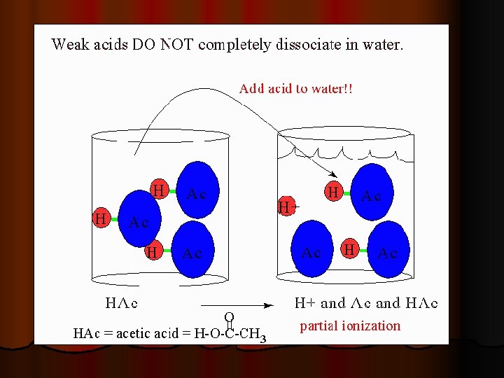 Net Ionic Equation l Of all strong acids plus strong bases: l H+ + OH- H 2 O l But what about weak acids and bases? l In a strong acid or base, it dissociates completely in water (strong electrolyte) l Weak acids and bases do not dissociate completely in water