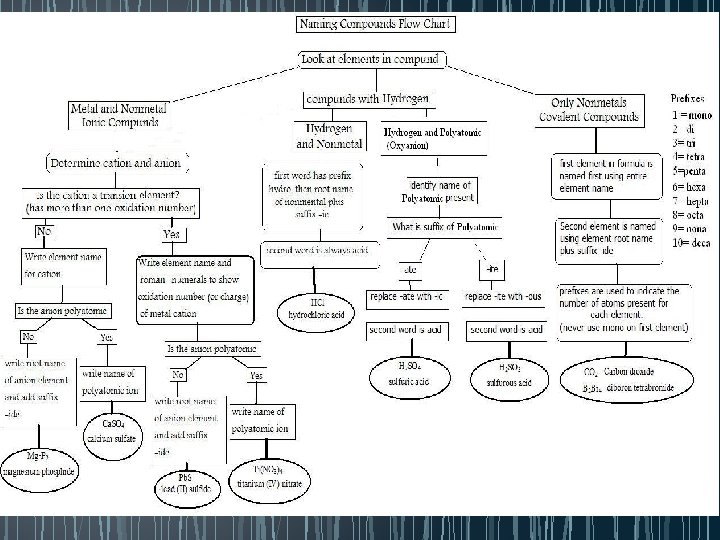 Formulas to names If the name has • Acid in the name: MUST balance charges • Hydroiodic acid • 2 elements H+1 and I-1 • HI • Sulfuric acid • More than 2 elements • Polyatomic ions: ate to ic, ite to ous • H+1 and SO 4 -2 • H 2 SO 4