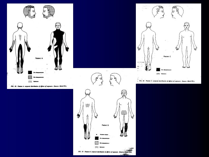 EP, CG, TK, GL e BZ diagnóstico: doenças de pele eritemas tornaram-se ulceras demarcadas com necrose central SO e ID diagnóstico: “dermatite tóxica” com infecções secundárias 18. 08. 97 recaída Todos os pacientes sinais gerais e sintomas doença crônica de radiação com ulceração na pele ( síndrome cutânea)
