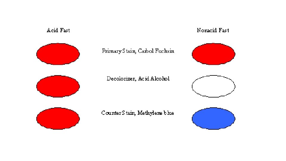 1 - Ziehl-Neelsen stain The procedure utilizes heat and phenol (carbolic acid) to help the penetration of the dye, basic fuchsin, to the inside of mycobacterial cells, which are impermeable to basic rosaniline dyes in routin stains such as the Gram stain. • Procedure : 1 - Primary stain: carbol fuchsin , 5 minutes then wash 2 - decolorizer : acid alcohol , 1 -2 minutes then wash 3 - counterstain: methylene blue, 1 minutes then wash