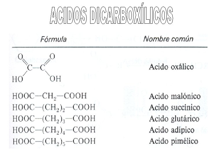 • ACIDOS AROMATICOS: • El aromático es el ácido benzoico y a los sustituidos se les da el nombre como derivados de éste. • Si el aromático no se encuentra enlazado directamente al COOH, el aromático se menciona como sustituyente. • Acido benzoico: COOH • Acido 3 -cloro benzoico : COOH Cl