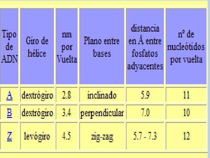 Hay tres tipos de estructura secundaria: A, B, Z. A: es dextrógira y las bases complementarias se encuentran en planos inclinados; el eje de la molécula atraviesa dichos planos por puntos desplazados del centro. Esta forma aparece cuando se deseca el ADN y no se ha encontrado en condiciones fisiológicas únicamente en el laboratorio.