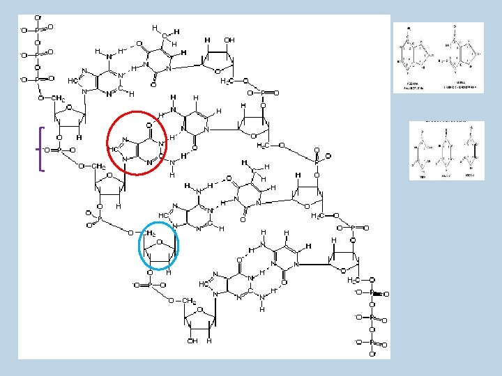 Estructura Secundaria: es el modelo de doble hélice dado por J. Watson y F. Crick. Dicho modelo está formado por dos hebras de polinucleótidos situadas de forma antiparalela (una con dirección 5’ a 3’ y la otra de 3’ a 5’ ) una al lado de la otra; formando puentes de hidrógeno entre las bases enfrentadas. Siendo las bases complementarias: A --T formando entre ellas dos puentes de hidrógeno. G ---C Entre ellas se forman tres puentes de H. Las dos hebras están enrolladas en torno a un eje imaginario, que gira en contra del sentido de las agujas de un reloj.