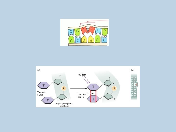 Mutación Inducida por daños del ADN Efectos de la Luz UV sobre el ADN La LUV al impactar las cadenas de ADN, provocan el rompimiento de un doble enlace Carbono-Carbono en la timina y si ésta se encuentra a la par de otra timina, sucederá lo mismo con ésta; por lo tanto entre las dos timinas se establecen enlaces covalentes, formando dímeros de timina, lo que afecta la replicación y transcripción del ADN.
