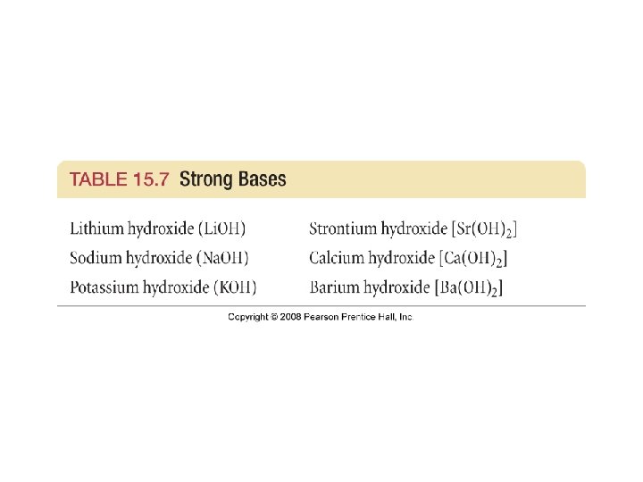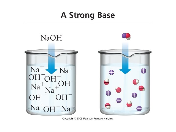 Bases • Base: a substance that, when put in water, increases the concentration of OH- ions or a substance that accepts H+ ions • Na. OH(aq) Na+(aq) + OH-(aq) • Strong Bases: bases that completely ionize in water