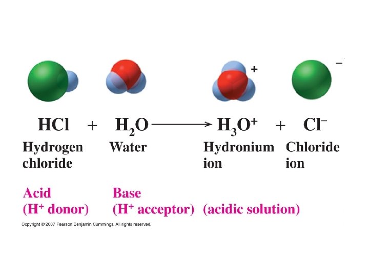 Acids and Bases • Acid: a substance that, when dissolved in water, increases the concentration of H+ (protons) H 2 O • HCl H+ + Cl • HCl + H 2 O H 3 O+ + Cl- • Strong acid: an acid that completely ionizes/dissociates in water • HNO 3 + H 2 O H 3 O+ + NO 3 • Strong electrolyte