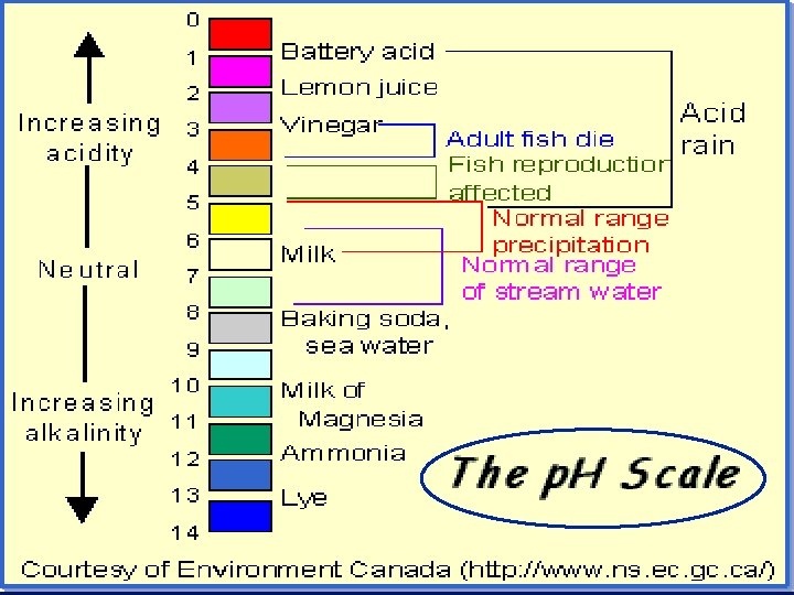 The p. H concept – from 0 to 14 n p. H = pouvoir hydrogene (Fr. ) “hydrogen power” n definition: p. H = -log[H+] n in neutral p. H = -log(1 x 10 -7) = 7 n in acidic solution [H+] > 10 -7 n p. H < -log(10 -7) – p. H < 7 (from 0 to 7 is the acid range) – in base, p. H > 7 (7 to 14 is base range)