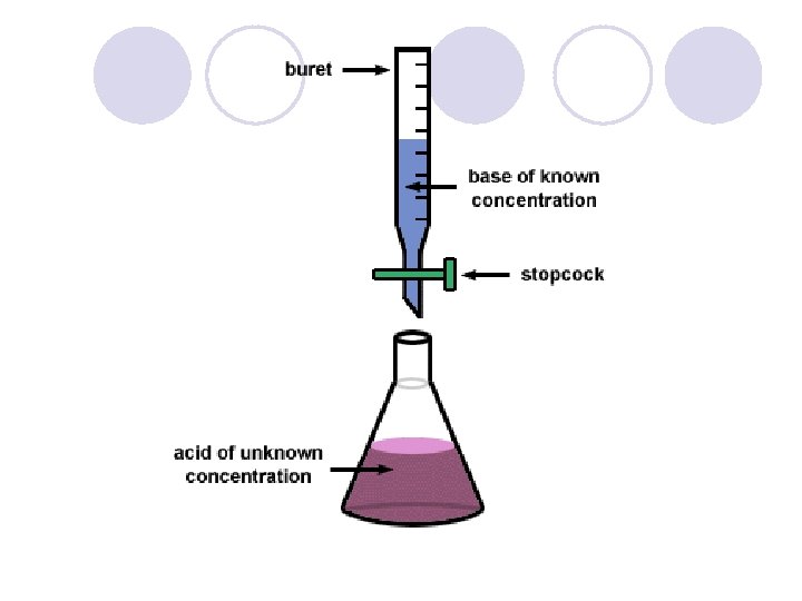 Acid-Base Titration l Process of adding measured volumes of an acid or base of known concentration to an acid or base of unknown concentration until neutralization occurs. l The known concentration is called the standard solution l There must be a ratio of 1: 1 between hydrogen ions and the hydroxide ions l To find the Molarity of a substance in a titration experiment, use the formula: M X V =M X V A A B B