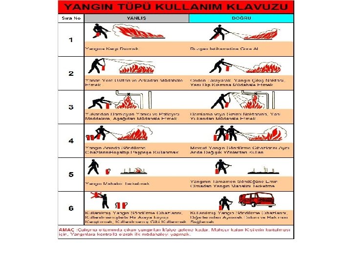 YANGIN SÖNDÜRÜCÜNÜN BÖLÜMLERİ • 1. Basınç saati: Yangın söndürücüde yeterli basınç olup olmadığını gösterir. • 2. Pim: Yangın söndürücü kullanılmadan önce çekilip çıkartılmalıdır. • 3. Hortum başı: Yangının kaynağına doğrultulmalıdır. • 4. Hortum: Esnek, kaliteli ve kullanılması kolay olmalıdır. • 5. Etiket: Yangın söndürücünün hangi tür yangınlar için olduğunu ve nasıl kullanılacağını gösterir. ( A-B-C ) • 6. Tarih etiketi: Son kullanım tarihini gösterir.