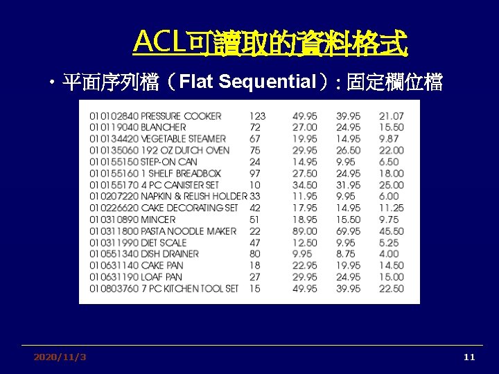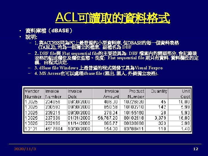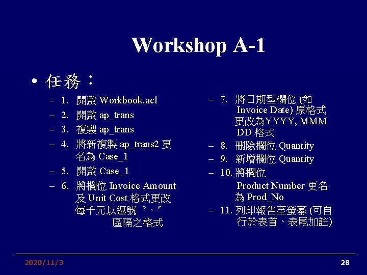 ACL Training Materials Unit A: ACL基本觀念及操作 主要參考資料來源: KPMG ACL課程講義資料 Price. Water. House. Cooper ACL課程講義資料 2020/11/3 1