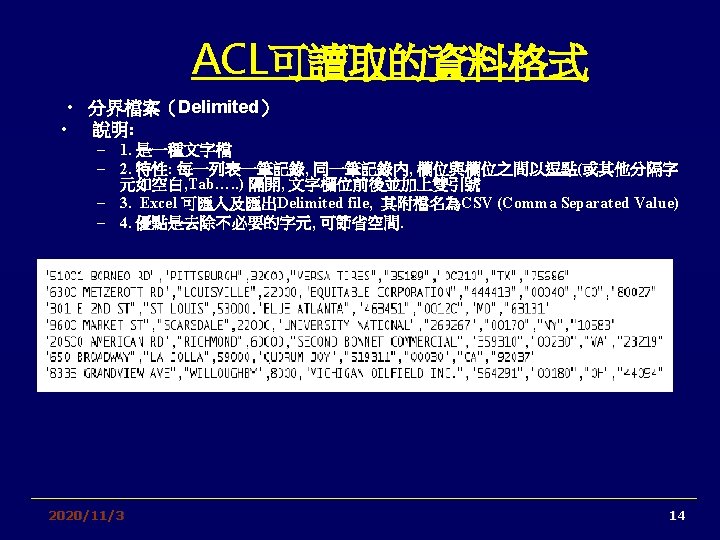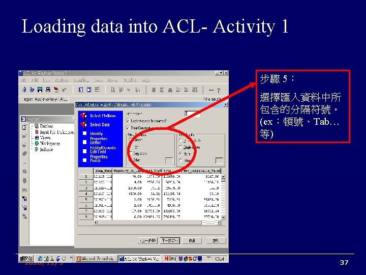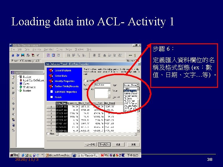 Loading data into ACL- Activity 1 步驟 8: 完成資料檔的匯 入後的如左如示。 2020/11/3 41