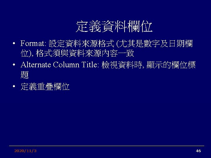 Input File Definition • 新增: • 啟動 Data Definition Wizard : [Overview]視窗, 點選[New] Icon • Select Data file to be defined • 將轉入資料命名及存檔: *. fil • Finish: 命名IFD名稱 • • 修改或手動設定: [Overview]視窗, 選取要修改的IFD 項目 選取 [Edit]/[Input File Definition] 選取 [Edit Fields/Expressions]頁面 2020/11/3 45